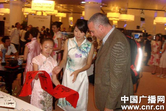 天津11歲小學生王灝融將現場書寫的書法作品送給外賓朋友(中廣網記者王嘉軍 攝)