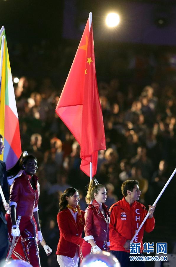 8月12日,第30屆夏季奧林匹克運動會閉幕式在倫敦奧林匹克體育場舉行。這是中國代表團旗手、奧運會女子激光雷迪爾級冠軍徐莉佳(右三)在閉幕式上高舉五星紅旗入場。新華社記者凡軍攝