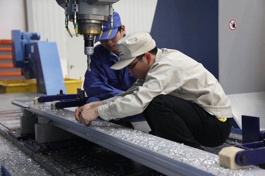 圖一:作為我國軌道交通裝備制造業的龍頭企業,目前,中國南車構建了鐵路機車車輛、動車組、城軌車輛自主研發、規模制造、規范服務的完整體系,同時積極發展儲能式輕軌、100%低地板有軌電車等戰略性新興產業。圖為南車株機公司工人正對鋁型材進行機械加工。