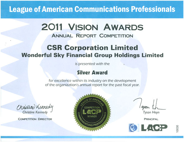 中國南車2011年年度報告在本屆評選中獲得97分(評選為百分制),在“致股東書函、內文敘述、財務摘要、創意設計、信息易讀性“等單項中均獲得滿分。LACP的總經理Christine Kennedy表示:“中國南車在今年的激烈競爭中表現卓越,以優異的水準獲得評委的青睞,總體上看,中國南車這次的表現接近完美。我們認為中國南車在本次比賽中的表現是這個行業當中最優秀的”。美國媒體專業聯盟年度報告“遠見獎”是備受業界尊崇的年報評選國際獎項之一,由世界著名營銷調查機構——美國通訊聯盟公司組織評選,在業界年報選舉中擁有重要地位。