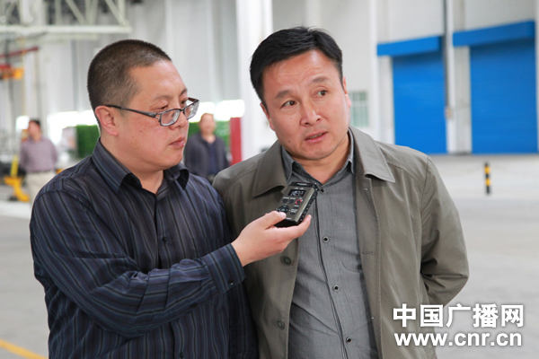 中央臺《傾聽新疆》采訪團成員,中央臺記者張雷(左)在陜汽新疆汽車有限公司采訪