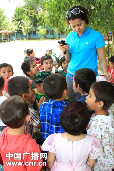 中央臺(tái)新疆民族語言廣播中心記者奴爾古力·依米爾在雙語幼兒園采訪中