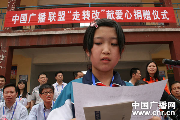 紅星楊小學(xué)學(xué)生代表感謝采訪團(tuán)愛心捐贈(zèng)(中廣網(wǎng)記者董浩攝)
