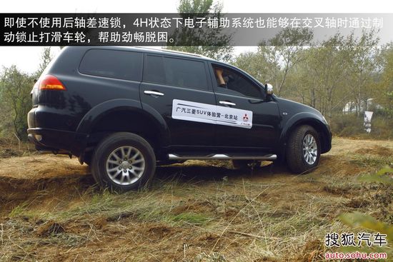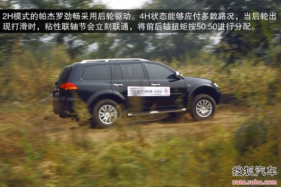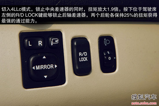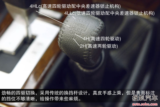 勁暢仍然使用傳統(tǒng)的四驅(qū)切換操作桿設計,操作桿與換擋桿采用了相同的真皮包裹,手感上乘。位于皮革表面的四驅(qū)檔位標示有些模糊,給初次接觸這套系統(tǒng)的用戶帶來了一些麻煩。其四驅(qū)采用三菱的SS4超選四驅(qū)系統(tǒng),提供2H(高速兩輪驅(qū)動)、4H(高速四輪驅(qū)動)、4HLc(高速四輪驅(qū)動配中央差速器鎖止機構)、4LLc(低速四輪驅(qū)動配中央差速器鎖止機構)四種模式。