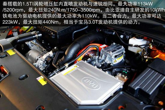動力方面:秦搭載的1.5TI渦輪增壓缸內直噴發動機與速銳相同,最大功率113kW/5200rpm,最大扭矩240N.m/1750-3500rpm,由比亞迪自主研發的10kWh鐵電池為驅動電機提供的最大功率為110kW。當二者合力,最大功率可達223kW,最大扭矩440Nm。傳動方面,該車匹配的是一臺DCT雙離合變速箱,官方表示該車0-100km/h的加速時間為5.9秒。