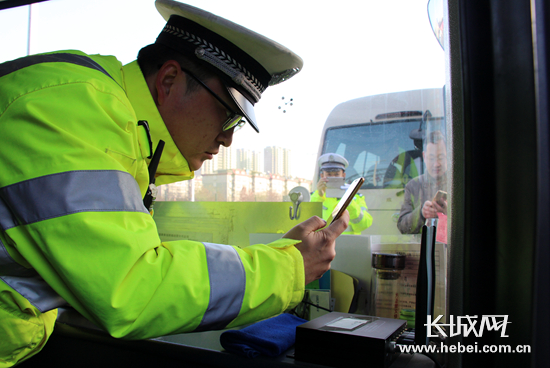 此外,記者在裕華高速口春運(yùn)安檢現(xiàn)場(chǎng)還看到,許多固定班線的客車上貼著一張二維碼。張博告訴記者,高速交警石家莊大隊(duì)在2016年春運(yùn)時(shí)研發(fā)了“客運(yùn)車核查平臺(tái)”。駐客運(yùn)站民警對(duì)途經(jīng)高速裕華路口班線客車信息(車輛狀況、乘客數(shù)量、司機(jī)乘務(wù)員情況、正常行駛情況、車輛違法記錄等)在離站前統(tǒng)一錄入核查平臺(tái)后,會(huì)自動(dòng)生成一張與該車對(duì)應(yīng)的紙質(zhì)二維碼,當(dāng)客車行至高速裕華口進(jìn)行檢查時(shí),民警只需使用手機(jī)專用的客車核查APP掃碼軟件掃描已粘貼的二維碼,車輛的所有信息會(huì)自動(dòng)顯示在手機(jī)上,從而提高安檢效率。