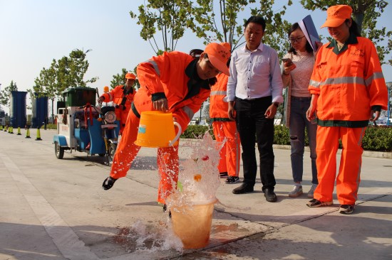 活動現場,環衛班長劉友珍和隊友參加了“新鐵人三項”活動。記者看到,兩人綁腿進行兩人三足行進,手里各自提一桶水,盡量保持平衡到達終點后,將水放上電動三輪車,一人騎行繞S彎通過十余個安全錐,行進中撿拾5個路面瓶蓋,并保持水不潑灑,第二人在終點等待,用兩桶水將一空桶內乒乓球沖出桶。