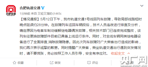 根據合肥城市軌道交通有限公司昨天發布情況通報顯示,5月12日下午約17:32,合肥市軌道交通1號線一列車在運行中突發故障,導致局部線路(合肥火車站至包公園站)部分列車晚點延誤約28分鐘。經緊急處置,約至18:00,該局部線路逐步恢復正常運營,期間無人員受傷,未造成其他影響,車輛故障原因正在排查當中。因此次故障對廣大市民出行造成不便,軌道公司表示誠摯的歉意。