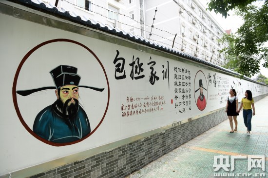 其中,貴池路近200米長的家訓墻最為亮眼,該文化墻以《論語》《包拯家訓》《朱子家訓》《曾國藩家訓》等名人家訓、國學經典內容為主題,輔以工筆畫和水墨畫的人物肖像生動展現名人家訓、國學經典、賢文化等家國情懷,弘揚優秀傳統家風、家訓、家規。(宋健龍 張大崗攝)
