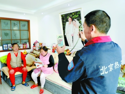 北京熱力石景山分公司魯谷服務(wù)中心五芳園服務(wù)站的工人師傅,來到魯谷路39號院2單元一戶居民家中測量室溫,客廳溫度超過20℃。記者 吳鏑攝