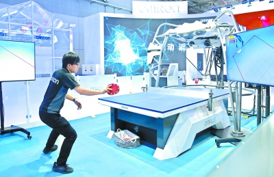 11月4日,工作人員在歐姆龍自動(dòng)化(中國)有限公司展臺測試打乒乓球的機(jī)器人。新華社記者 張玉薇 攝
