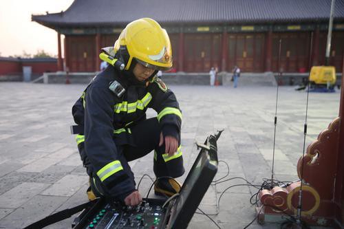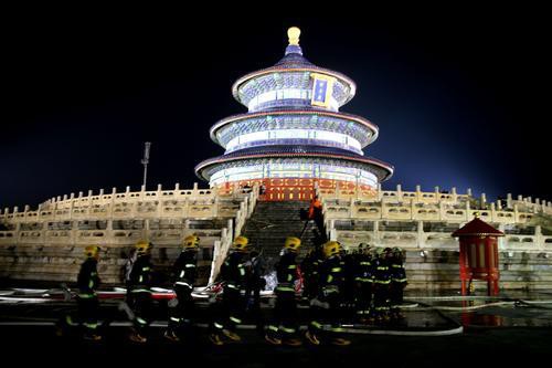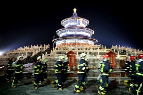 2019年9月6日晚,消防隊員從祈年殿四個方向架設移動水炮、消防機器人和云梯車對祈年殿起火部位進行撲救。當晚,北京東城消防支隊聯合天壇公園舉辦了文物古建應急救援綜合演練。此次演練,包括人員疏散、搶救文物、滅火救援等突發事件的處置,歷時約40分鐘。