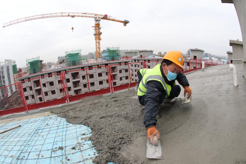 4月8日拍攝的幾名中鐵二十二局集團雄安公司工人正在北京“中國鐵建·玉景陽光”共有產權房房頂進行混凝土澆筑作業。攝影:孔祥文