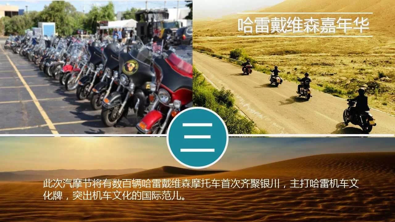2016年8月7日至9日,首屆中國·寧夏(銀川)絲綢之路國際汽車摩托車自駕旅游節暨哈雷戴維森中國第八屆全國車主騎行活動將在寧夏回族自治區首府銀川市舉辦。據介紹,本屆汽摩節將舉辦“絲路旅行從銀川啟航”攝影大賽、黃河風情民俗展演、賀蘭山汽車摩托車場地賽、機車大巡游、水上運動表演、汽摩節狂歡夜、哈雷戴維森嘉年華、汽摩車友暢游銀川等八大系列活動,突出四大亮點: