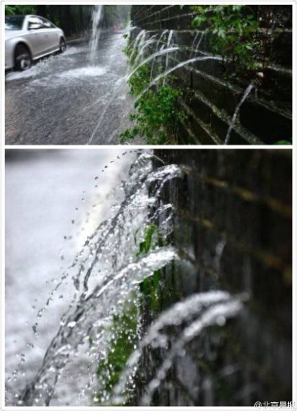 網上熱傳的照片顯示,在太平門以東龍脖子路的那段明城墻,距離地面1米多的位置,出現幾十個水柱,大量雨水從城墻內部通過縫隙排出。而在距離地面四五米處,墻體上還有兩個大型的青石吐水槽,吐出兩條更大的水柱。
