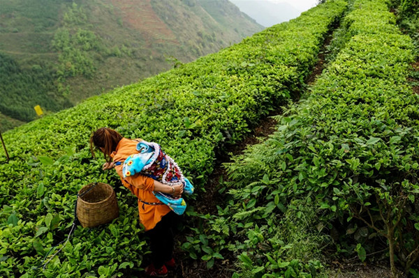 一名隆林苗族婦女背著還沒滿周歲的孩子上山采茶