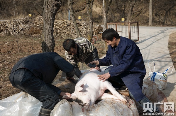 楊軍軍和隔壁村的“老屠戶”一起燙豬刮毛(中央廣播電視總臺央廣記者 王妍 攝)