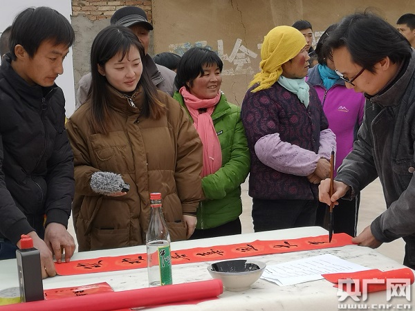 趕上秦州區組織書法家幫鄉親們寫春聯,楊軍軍選了一副“脫貧攻堅奔小康 歡歡喜喜過大年”的春聯(中央廣播電視總臺央廣記者 孟永輝 攝)