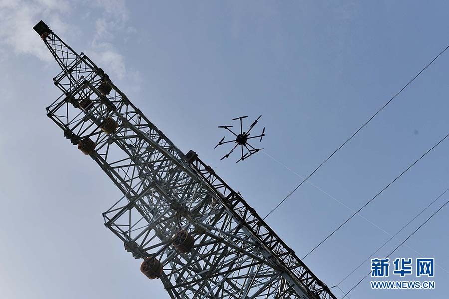 無人機攜帶引線,即將跨過鐵塔。新華網 李相博攝 -