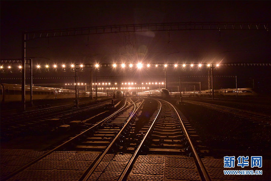 凌晨,重慶西動車運用所存車場,檢修后的動車組就停放這里。新華網發(陳亞 攝)