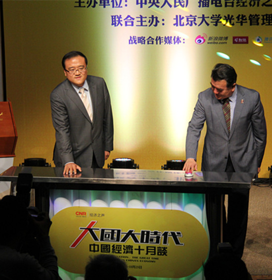 央廣網財經北京10月14日消息 由中央人民廣播電臺經濟之聲、央廣網財經主辦的《大國大時代----中國經濟十月談》系列時事報告會,10月14日在北京大學啟動,中央人民廣播電臺臺長王求和北京大學光華學院黨委書記冒大衛先生共同按下啟動按鈕,正式拉開這次系列時事報告會序幕。