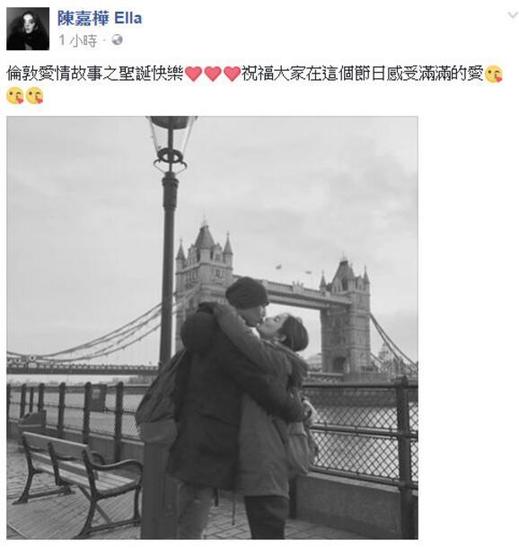 Ella 25日一早在臉書上曬出和老公在倫敦塔橋前的照片,她勾著老公脖子,對方則一把攬住她的腰、低頭親吻,她也嘟起嘴巴,嘴角還微微上翹,兩人幸福模樣看起來就像書中童話,而她也留言祝福粉絲:“倫敦愛情故事之圣誕快樂,祝福大家在這個節日感受滿滿的愛”。