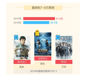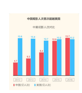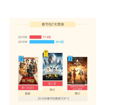 自2010年起,中國電影票房一直保持著高速增長。2016年初,《美人魚》《澳門風云3》《西游記之孫悟空三打白骨精》等春節(jié)檔大片繼續(xù)攪熱中國電影市場。據(jù)淘票票《2016年中國影市報告》數(shù)據(jù)顯示,春節(jié)檔7天上映的9部影片聯(lián)手貢獻了36.5億票房,相比去年同比增長19億。其中,《美人魚》更是創(chuàng)下了33.9億的票房奇跡。