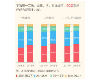 近年來,中國電影市場急速擴張,“網(wǎng)生代”觀眾電影消費能力漸強。2016年,90后群體已成功超越80后成為新一代票房主力軍。《2016年中國影市報告》顯示出,不管在一二線、或三到五線城市,90后群體占比都明顯上漲,這些年輕觀眾不僅熱忱度高,且在觀影、影片互動上均十分活躍,顯現(xiàn)出了對于票房巨大的影響力。