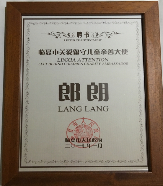 慈善音樂會現場,臨夏市人民政府邀請郎朗擔任“臨夏市關愛留守兒童公益親善大使”,臨夏州委常委、臨夏市委書記曹正民向郎朗頒發“臨夏市關愛留守兒童親善大使”聘書,臨夏市人民政府市長郭維安與郎朗共同為臨夏市關愛留守兒童公益基金揭牌。