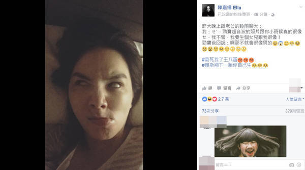 Ella睡前習慣和老公談天,她表示看完勁寶超聲波照片,直呼跟老公小時后長的相當神似,便嬌羞跟老公預約要生第二胎,而且還是要生個長得很像的女兒,未料老公竟回“那不就會很像男的”,這讓Ella瞬間大動肝火,不僅大罵老公“王八蛋”,還指名道姓要他下胎自己生,對此粉絲直呼夫妻間的對話好可愛,根本就是在放閃。
