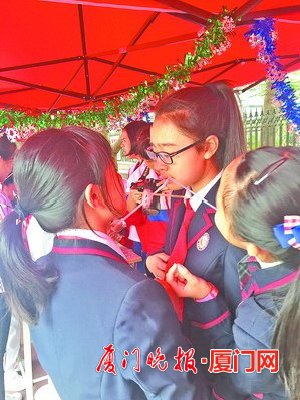 六年(2)班的陳錦璇和賴鷺宸在攝影社的攤位前玩起游戲,她們嘴里含著吸管,用吸管傳遞一個(gè)透明膠。經(jīng)過(guò)了三分鐘的嘗試,她們終于圓滿完成了任務(wù)。“嘴巴都酸死啦!”陳錦璇開(kāi)心地說(shuō),工作人員在她們的積分卡上蓋了一個(gè)小紅章,據(jù)說(shuō),完成任務(wù)蓋滿12個(gè)紅章就可以拿到獎(jiǎng)品了。