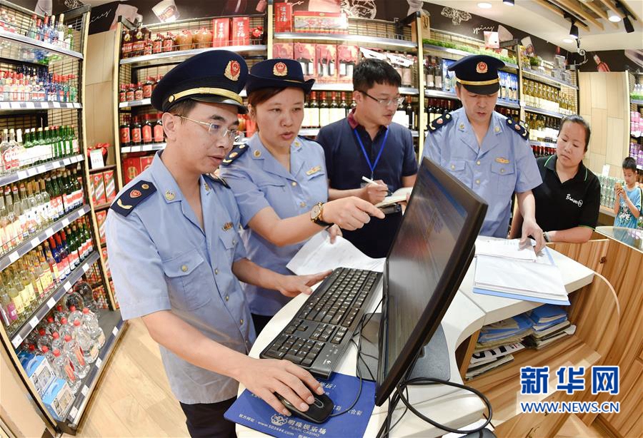 5月24日,在福州市臺(tái)江區(qū)一家超市的酒類專區(qū),“四風(fēng)”督查組人員在核查大宗團(tuán)購及提貨記錄。新華社記者 宋為偉 攝