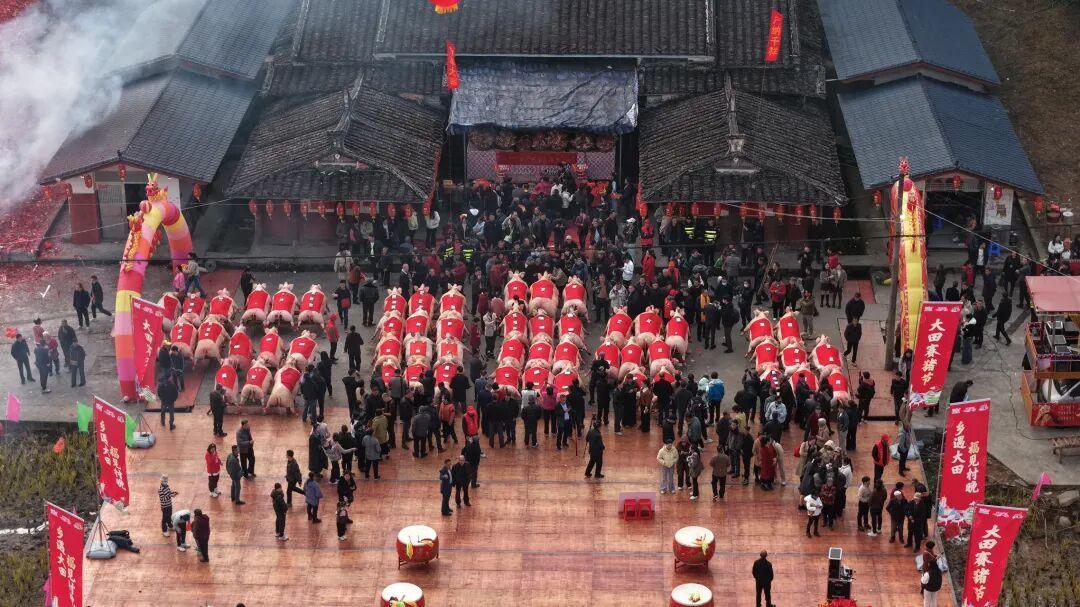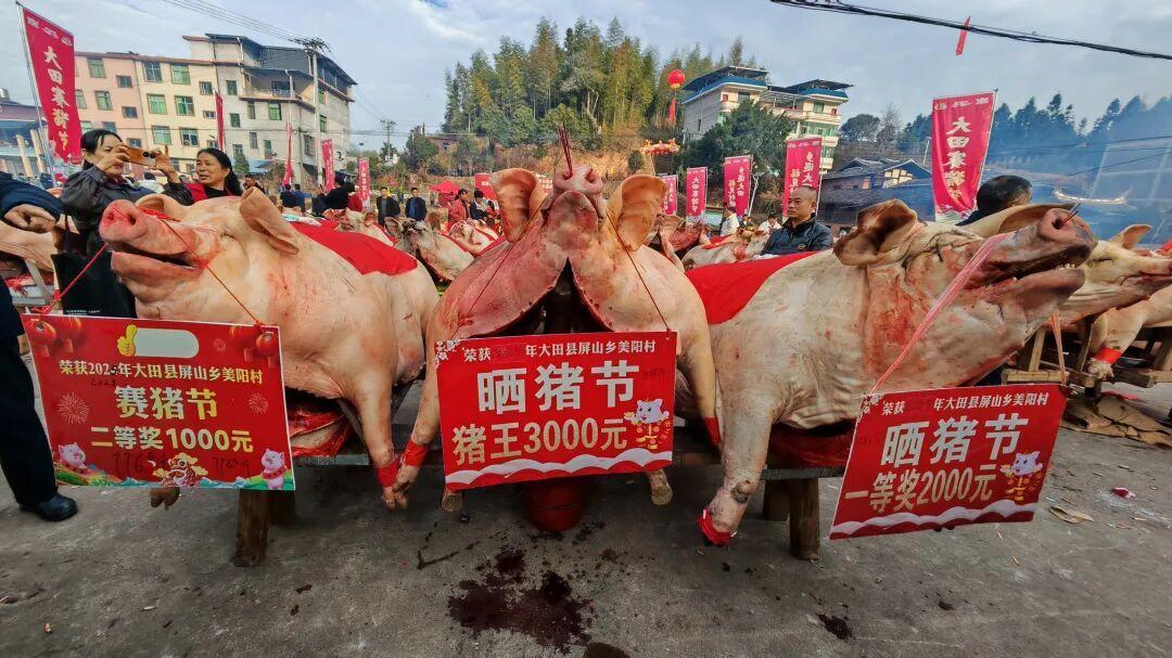 12月12日,福建省大田縣屏山鄉美陽村迎來一年一度的盛事——第七屆“賽豬節”非遺系列活動,F場鑼鼓喧天,人頭攢動,58頭佩戴紅綢的福豬整齊陳列于祠堂前。其中,村民郭顯文家庭飼養的一頭大肥豬以凈重886斤的佳績,榮膺本屆“豬王”桂冠,成為全場矚目的焦點。