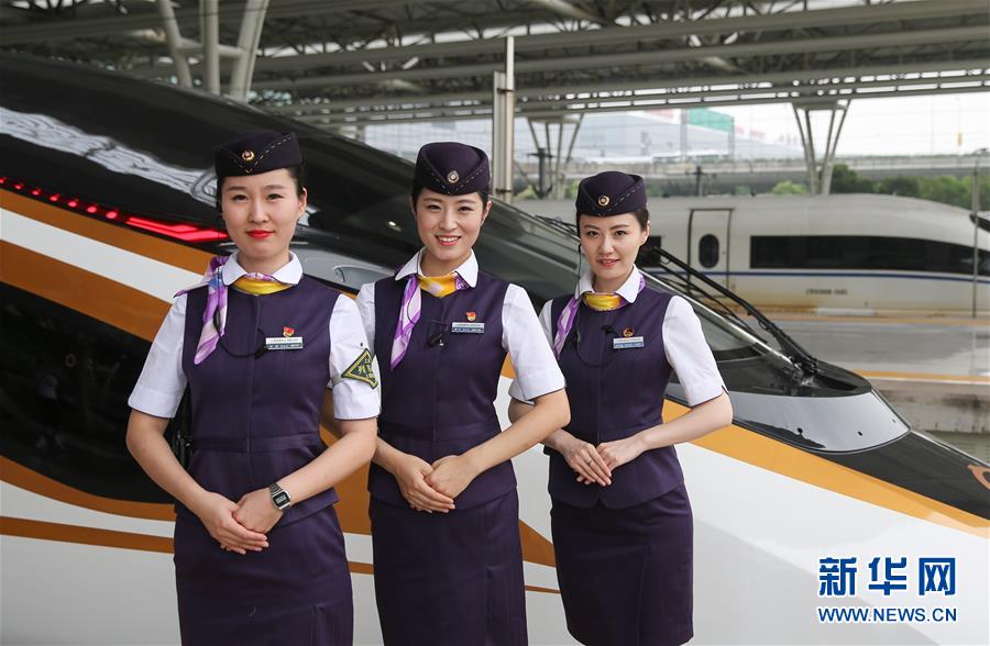 6月26日,在上海虹橋火車站,乘務人員站在“復興號”G124次列車旁。 當日,中國標準動車組“復興號”在京滬高鐵兩端的北京南站和上海虹橋站雙向首發,分別擔當G123次和G124次高速列車。“復興號”是由中國鐵路總公司牽頭組織研制、具有完全自主知識產權、達到世界先進水平的中國標準動車組。 新華社記者丁汀攝 -