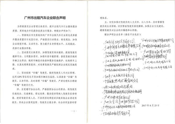 聯合聲明企業名單如下(排名不分先后):廣州市白云出租汽車集團有限公司、廣州交通集團出租汽車有限公司、廣州市廣駿旅汽集團、廣州市天湖旅游出租汽車有限公司、廣州市廣發出租汽車有限公司、廣州市新東方出租汽車有限公司、廣州蜆富出租汽車有限公司、廣州市利士風汽車有限公司、廣州市龍的出租汽車福分有限公司、廣州明通汽車出租服務有限公司、廣州慶星汽車出租有限公司、廣州市白云區云通汽車出租有限公司、廣州市廣達出租汽車有限公司、廣東國旅出租汽車有限公司、廣州聯星出租有限公司、廣東農墾燕嶺大廈有限公司、廣州東方汽車有限公司、廣東省珠江航運有限公司汽車出租分公司、廣州珠江汽車服務公司、廣州麗新汽車服務有限公司、廣州江南汽車出租公司