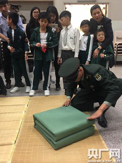 駐港部隊的戰士們向香港學生展示如何疊“豆腐塊兒”被子