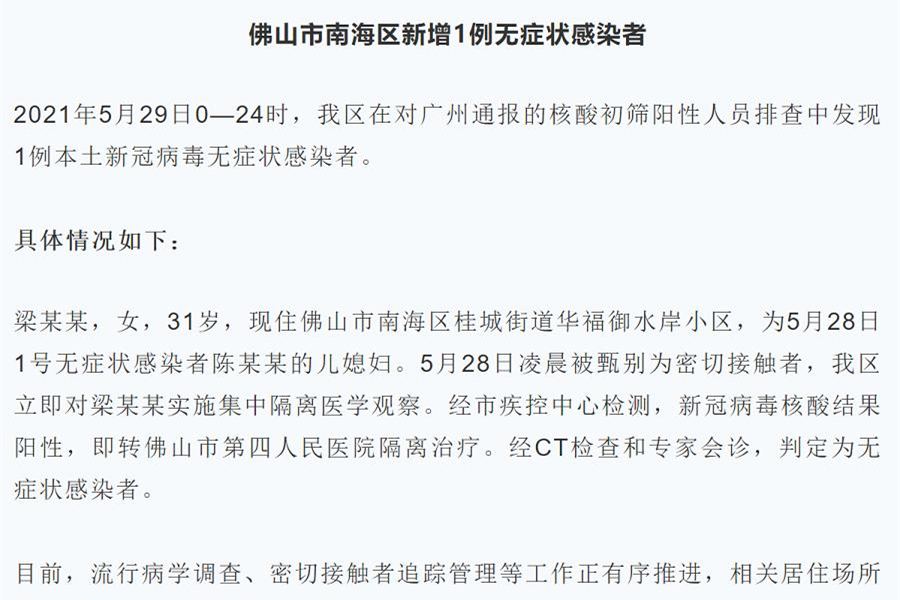 5月30日,佛山市禪城區報告1例本地新冠肺炎確診病例。據稍早前通報,該病例為女,40歲,現住佛山市禪城區綠茵鳴苑,5月27日判定為無癥狀感染者。5月30日,出現發熱癥狀、復查CT顯示肺部有炎癥,經專家會診,診斷為確診病例。
