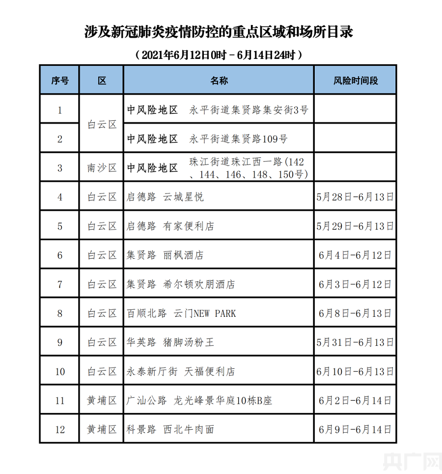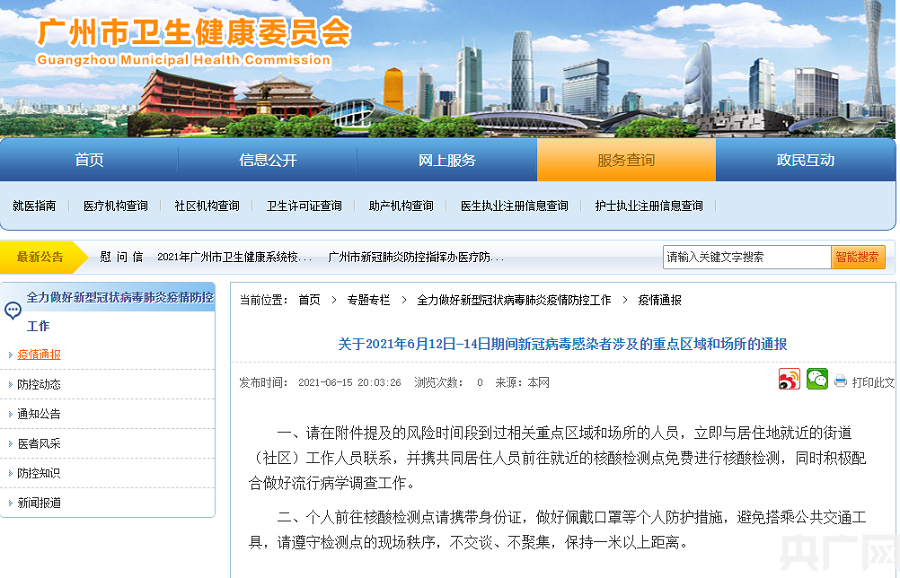 央廣網(wǎng)廣州6月15日消息(記者 張勝強)6月15日晚,廣州市衛(wèi)健委網(wǎng)站發(fā)布了關(guān)于2021年6月12日-14日期間新冠病毒感染者涉及的重點區(qū)域和場所的通報:
