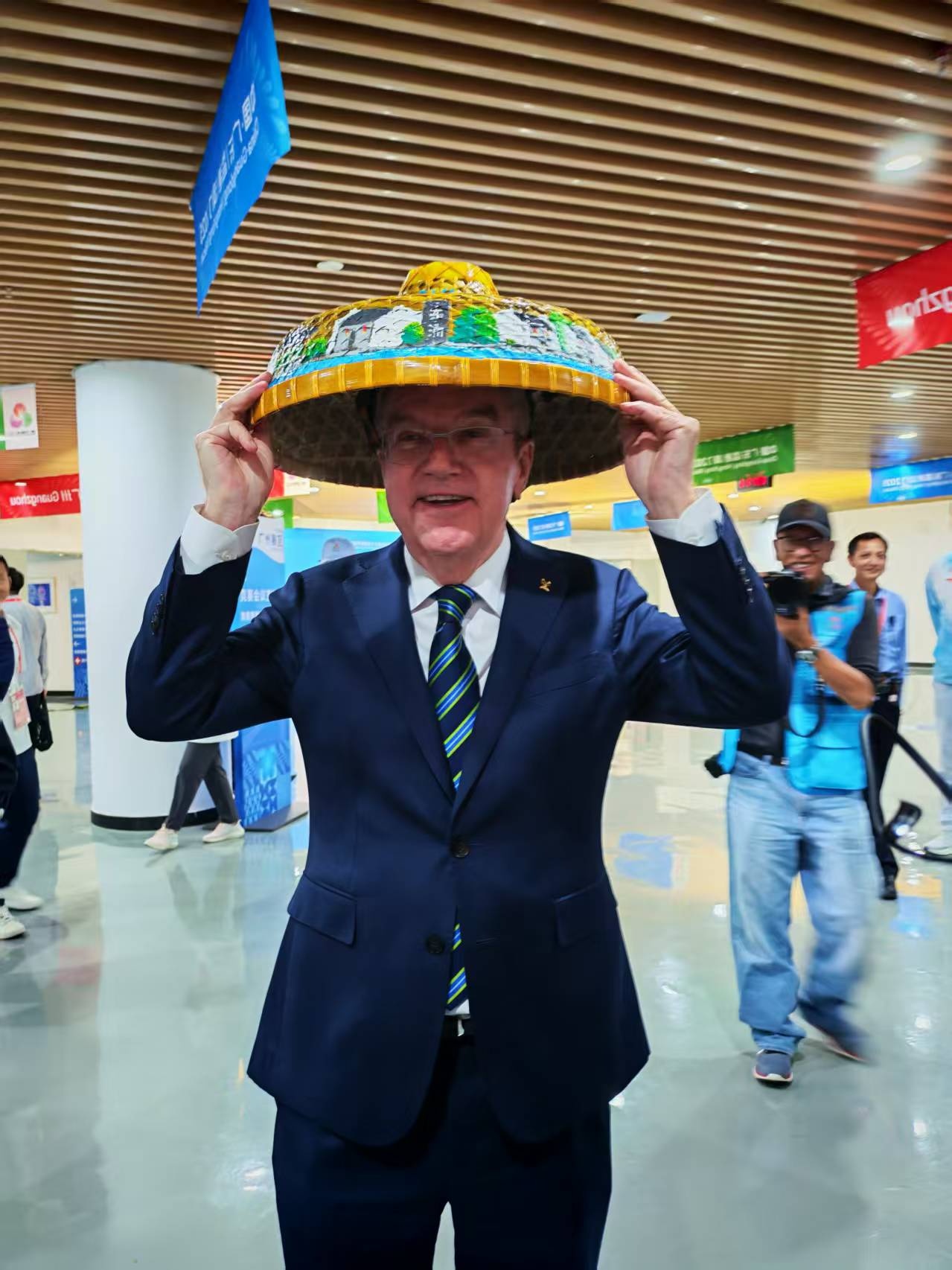 巴赫見到帽子后仔細(xì)端詳并聽取介紹,愉快地接受這份特殊的禮物,在準(zhǔn)備離開場(chǎng)館時(shí),又從工作人員手中拿過帽子戴上,并主動(dòng)展示給在場(chǎng)的媒體幫他拍照留念。
