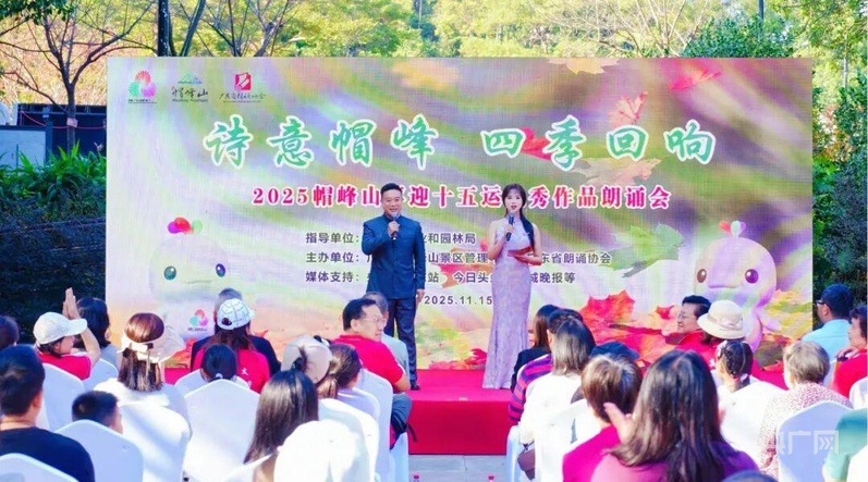 央廣網廣州11月17日消息(記者羅世偉 通訊員伊然)激情全運會,活力大灣區,魅力新廣州。在第十五屆全國運動會如火如荼舉行之際,為表達喜迎全運會的喜悅之情,用美好的聲音助力全運會。11月15日下午,“詩意帽峰· 四季回響”——2025帽峰山喜迎十五運優秀作品朗誦會,在廣州城區最高峰帽峰山景區內的政協園成功舉行。本場活動由廣州市林業和園林局指導,廣州市帽峰山景區管理中心、廣東省朗誦協會聯合主辦。