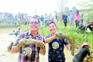在昨天舉行的萬(wàn)人抓魚(yú)大賽中,捕魚(yú)“勇士”與數(shù)十斤的大魚(yú)搏斗,驚險(xiǎn)刺激。活動(dòng)結(jié)束后,游客紛紛與自己抓到的大魚(yú)合影,最重的大魚(yú)超過(guò)40斤。
