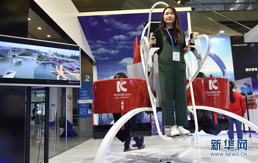 11月16日,觀眾在第十九屆中國(guó)國(guó)際高新技術(shù)成果交易會(huì)的光啟科學(xué)展臺(tái)體驗(yàn)“馬丁飛行包”。新華社記者 毛思倩 攝