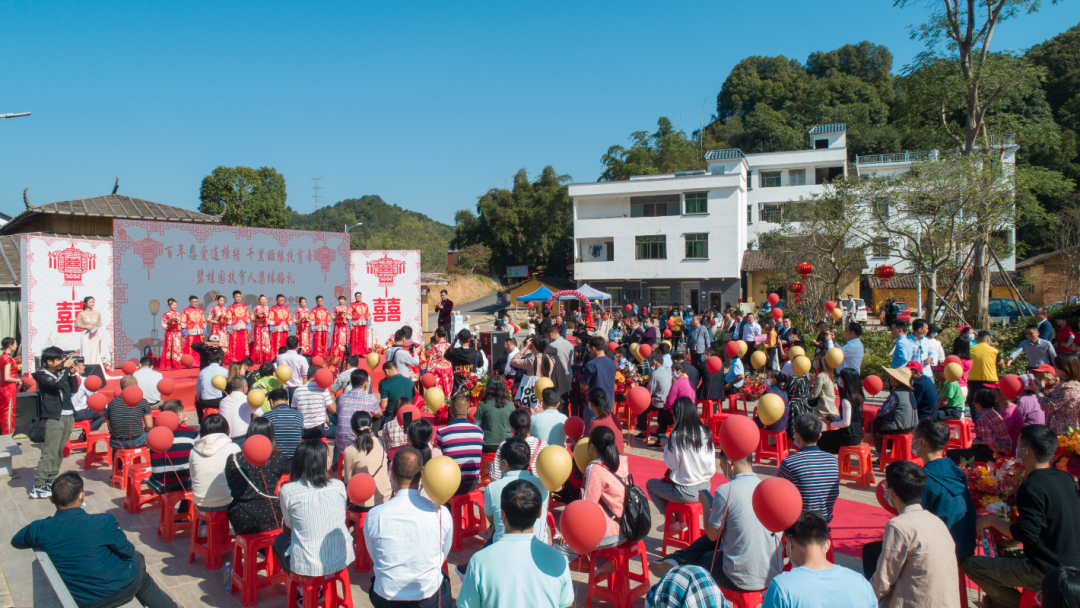 從魚咀開車一個多小時,就到了英德連江口鎮(zhèn)連樟村,6對新人在汀步觀景臺舉行了簡單的婚禮儀式。2018年習(xí)近平總書記在連樟村考察時說:“鄉(xiāng)親們一天不脫貧,我就一天放不下心來。”現(xiàn)在的連樟村已經(jīng)大變樣了——2019年底,全村54戶131名貧困人口已經(jīng)全部達(dá)到脫貧退出標(biāo)準(zhǔn);農(nóng)家樂生意紅火,老板的拿手好菜麻竹筍炒肉片更是遠(yuǎn)近聞名。儀式當(dāng)天,國務(wù)院扶貧辦全國貧困村創(chuàng)業(yè)致富帶頭人(碧桂園連樟村)培訓(xùn)基地揭牌暨首次開班儀式在連樟村鄉(xiāng)村振興學(xué)院舉行,學(xué)院將為貧困地區(qū)培養(yǎng)出更多的創(chuàng)業(yè)致富帶頭人。