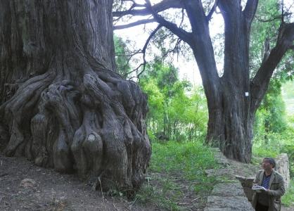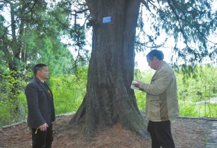 在編號00394的古柏前,劉樹榮和王均林放下雨傘,掏出皮尺,圍著樹干測量。王均林瞄一眼皮尺上的數據,打開隨身攜帶的本子,記錄下這棵樹的數據:胸徑185厘米,樹高23米……