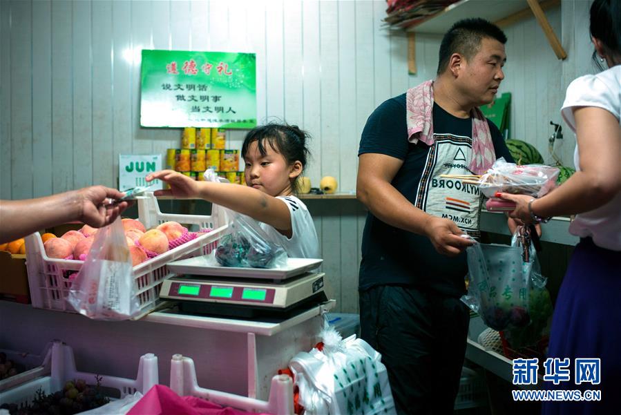 安徽合肥市蜀山區(qū)淺水灣社區(qū)一家水果店內,來自安徽廬江縣的“小候鳥”、9歲的張司晨(左)幫著爸爸張進(右二)一起賣水果(7月27日攝)。