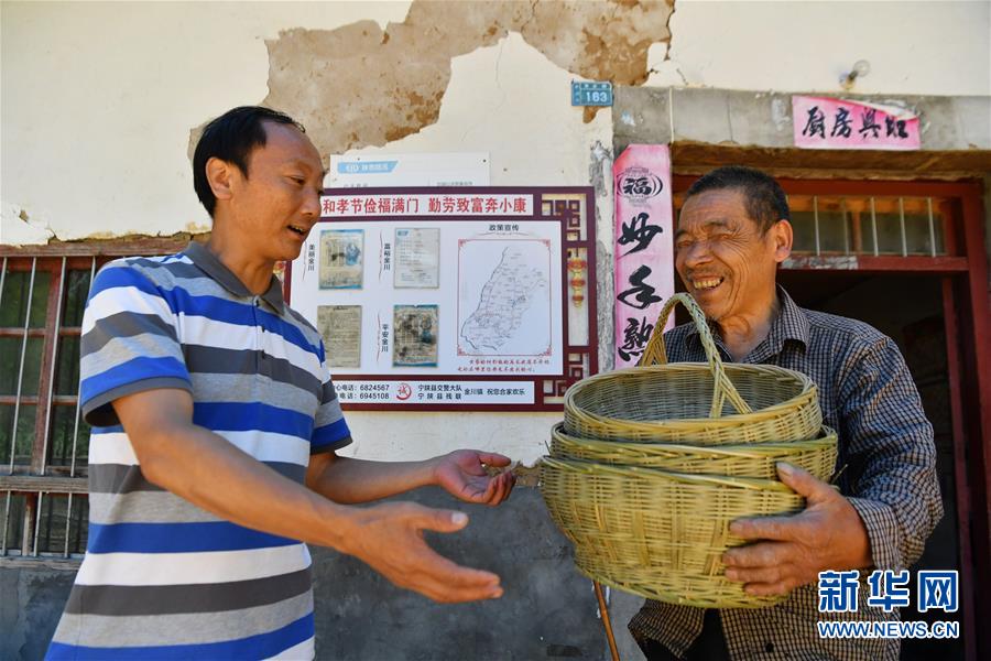 8月29日,黃金村村干部到楊繼學(右)家中幫助他銷售竹籃。