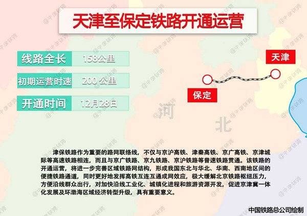 記者從中國鐵路總公司獲悉,12月28日,天津至保定鐵路(俗稱津保鐵路)開通運營,天津到保定的運行時間將由原來的最快2小時36分壓縮至1小時左右,東北到華北、華南、西南地區間的運行時間也將大幅度壓縮。