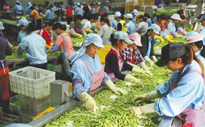 日前,昌江綠寶農產品集配中心,工人們在清洗、篩選運往浙江省杭州市的20萬斤毛豆。據介紹,經加工包裝后,每年約有4.7億斤農產品從該集配中心銷往全國各地。