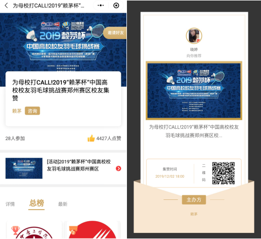 拉票活動于12月2日正式在賴茅官方小程序上線。微信搜索“不賴活動”小程序,點擊進入2019“賴茅杯”中國高校校友羽毛球挑戰賽鄭州賽區,在點贊排行榜的總榜中找到自己的學校即可進行點贊。各參賽隊伍還可將帶有自己學校LOGO的點贊頁面保存為圖片,分享給微信好友或轉發至朋友圈,邀請親朋好友為自己的學校點贊。投票截止時間為12月6日,各參賽隊伍所在學校的票數將會在小程序中實時公布。