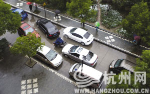 央廣網河南分網消息 據杭州網報道:昨天下午3點10分,我們到崇文實驗學校門口看了看。學校在近江小區內,小區道路比較窄。學校門口的路大約七八米寬,有一側是固定停車位,一旦有車在學校門口停留,就會發生擁堵。